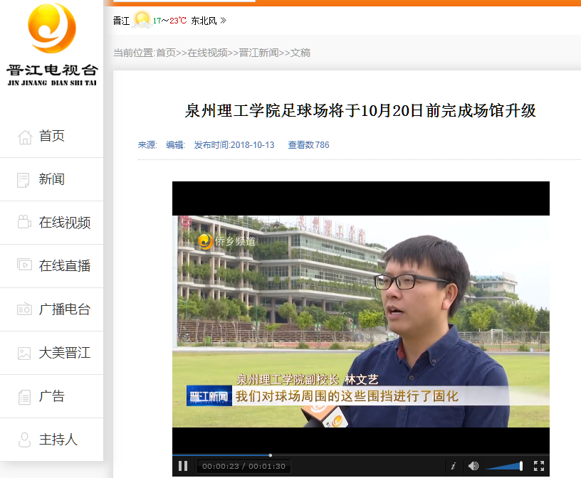 【晋江电视台】泉州理工学院足球场将于10月20日前完成场馆升级