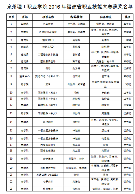 由福建省职业院校技能大赛组委会主办的2016年福建省职业院校技能大赛于2015年12月25日-2016年4月10日分两批举行。 我校共有19个参赛项目,23支参赛队伍,22位指导老师,56名参赛学生赴4个城市8个不同赛...