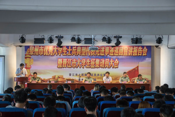 晋江大学生征兵大会在我校召开 大学生们正在向士兵们咨询征兵政策 5月12日上午,泉州市优秀大学生士兵典型代表先进事迹巡回宣讲报告会暨晋江市大学生征兵动员大会在我校633报告厅举行。晋江市委常委、人民武装...