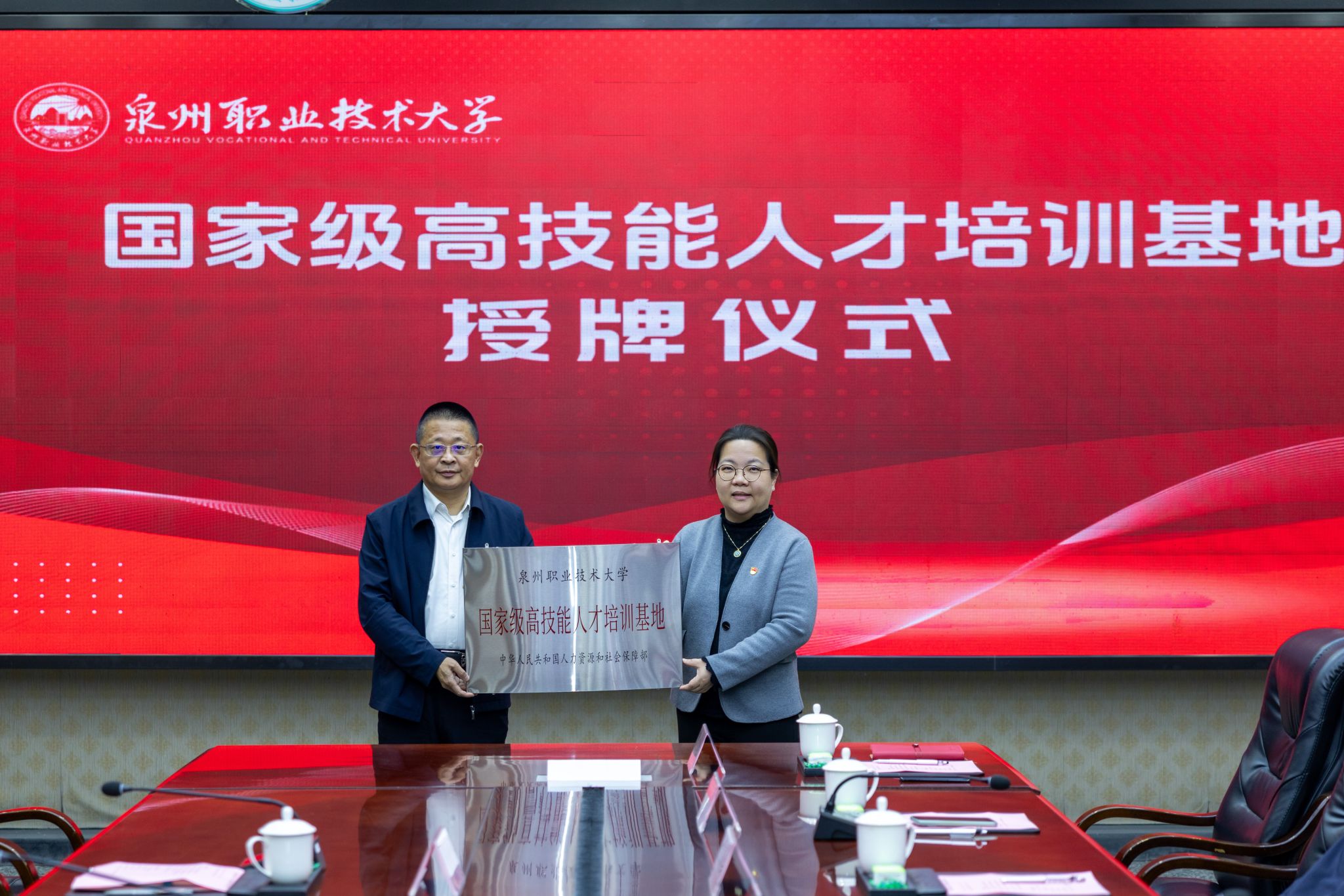 3月6日下午,国家级高技能人才培训基地授牌仪式,在泉州职业技术大学第一会议室隆重举行。泉州市人力资源和社会保障局局长许长春、副局长郑强、职建科科长杨志建、副科长郭瑞雯,晋江市人社局局长柯发音、泉州市高教发展中心主任黄永东,与我校校长吴滨如、校务顾问吴建生、副校长郭霏霏、林文艺,校长助理苏康敏,校工会主席陈其生,及相关职能部门负责人等出席仪式。许长春为泉州职业技术大学颁授“国家级高技能人才培训基地...