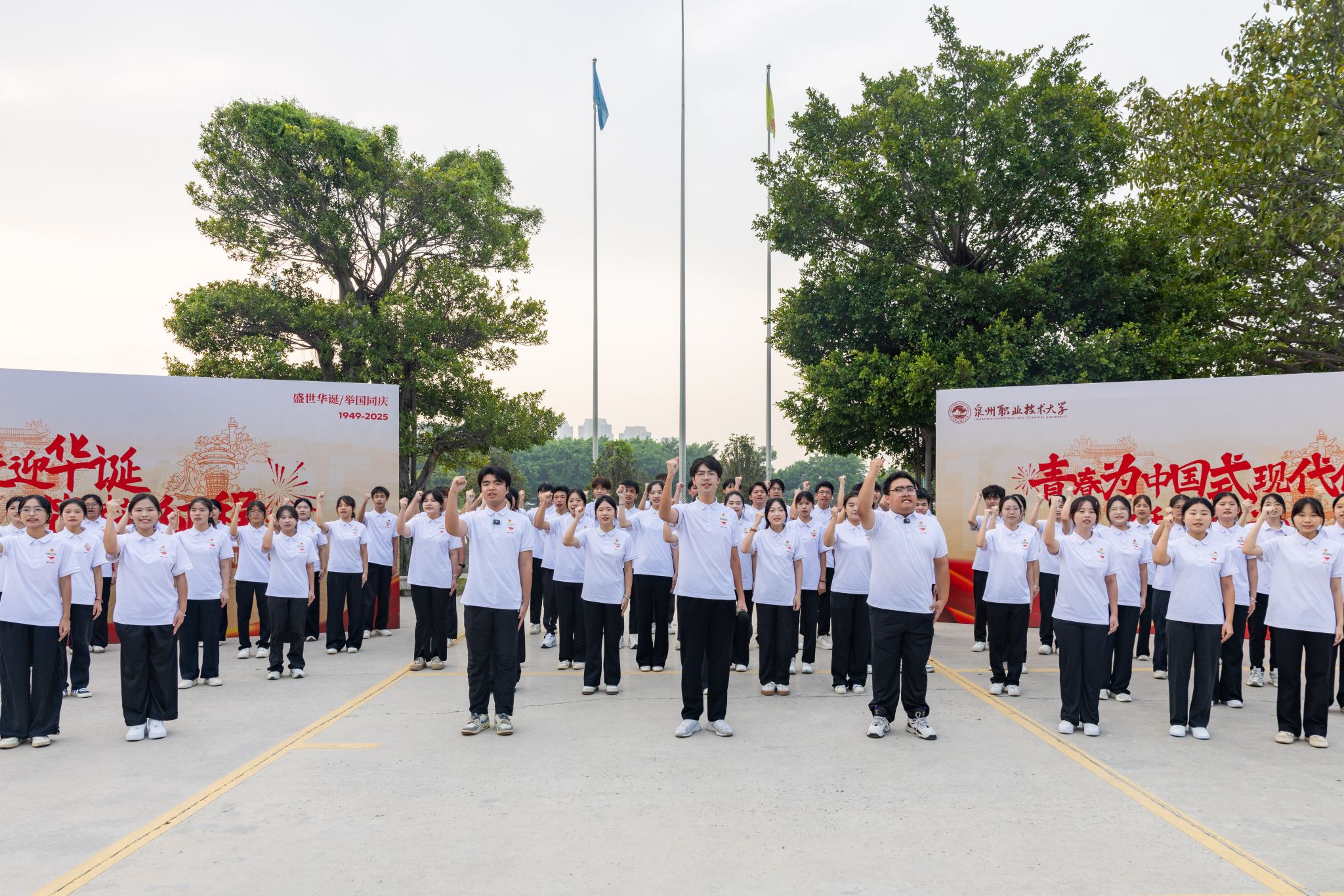 “80年前,中华儿女用忠诚与坚韧赢得民族独立;今天,泉大青年要以奋斗与担当续写复兴华章!”傅志雄在国旗下讲话,结合抗战精神与学校39年办学初心,向全体师生提出三点期许。