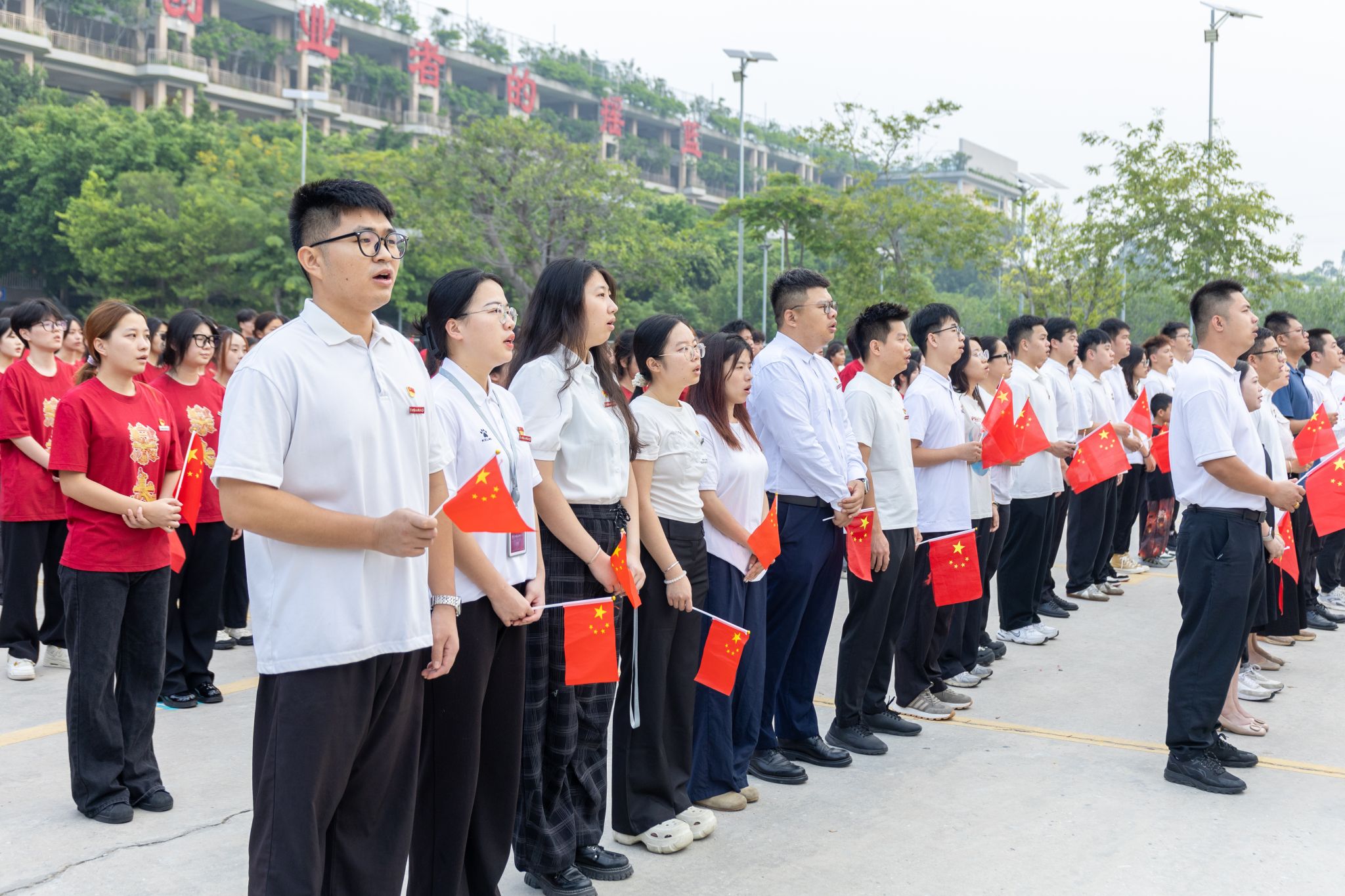“五星红旗迎风飘扬,胜利歌声多么响亮……”升旗仪式尾声,全体师生齐声高唱《歌唱祖国》,嘹亮的歌声回荡在校园每个角落。师生们挥舞着小国旗,眼中闪烁着激动的光芒,用最真挚的歌声传递对祖国的祝福,用最昂扬的姿态展现泉大青年的活力。