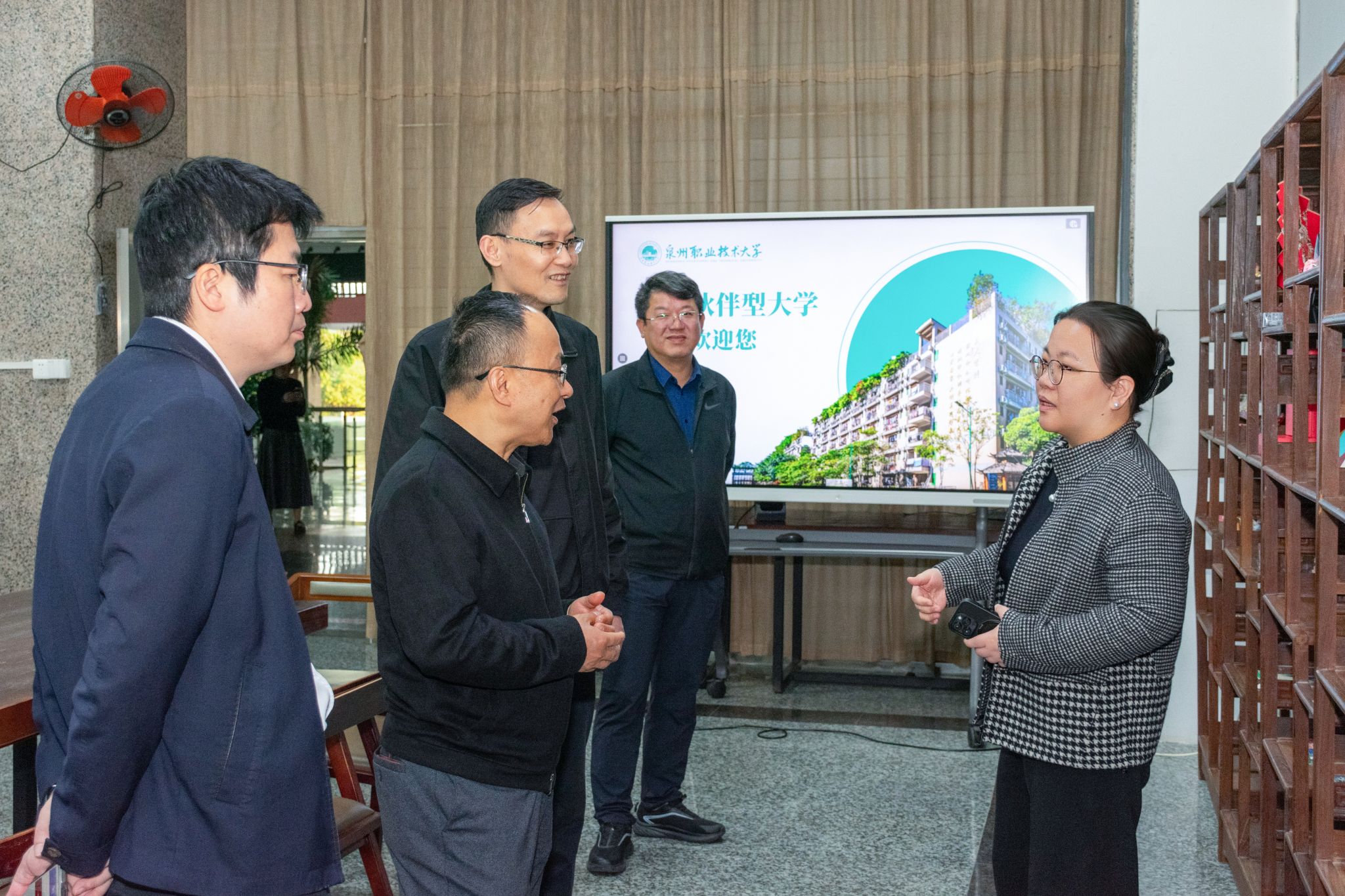 泉州市数据管理局党组成员/二级调研员施金洋、泉州市数据管理局科长邓礼靖,我校校长吴滨如、校务顾问吴建生、副校长郭霏霏陪同调研。