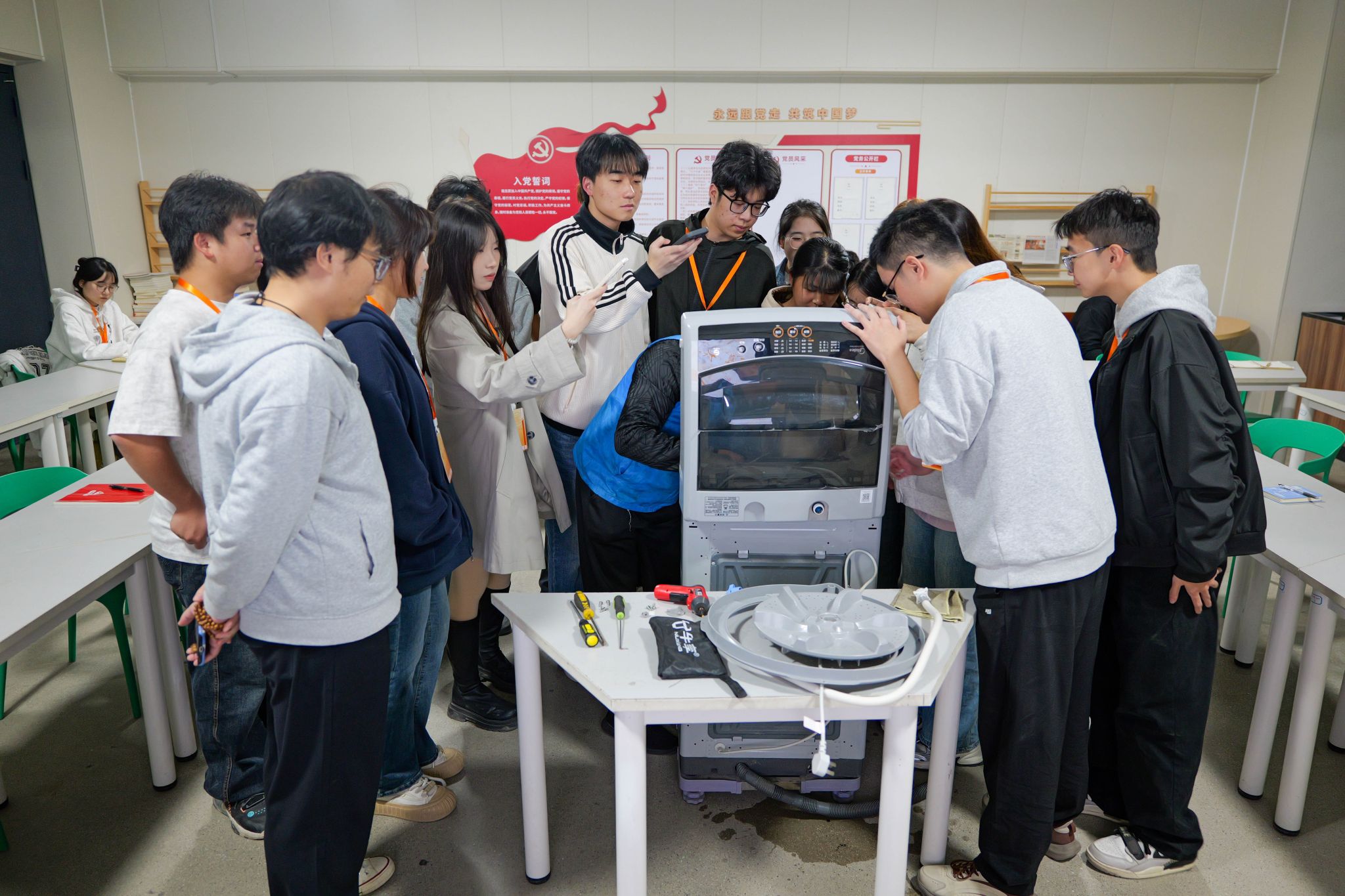 启动仪式在100391-100392教室举行。共享服务中心副主任洪昆炼、拾德书院党总支书记王秋玲与30余名师生共同见证活动启程。王秋玲书记在致辞中表示,洗衣机清洁关乎卫生健康与生活品质,活动不仅着力改善洗衣环境,更旨在培育学生自我服务与服务他人的意识。洪昆炼副主任表示,中心将全力提供物资与技术保障,确保活动安全有效推进。