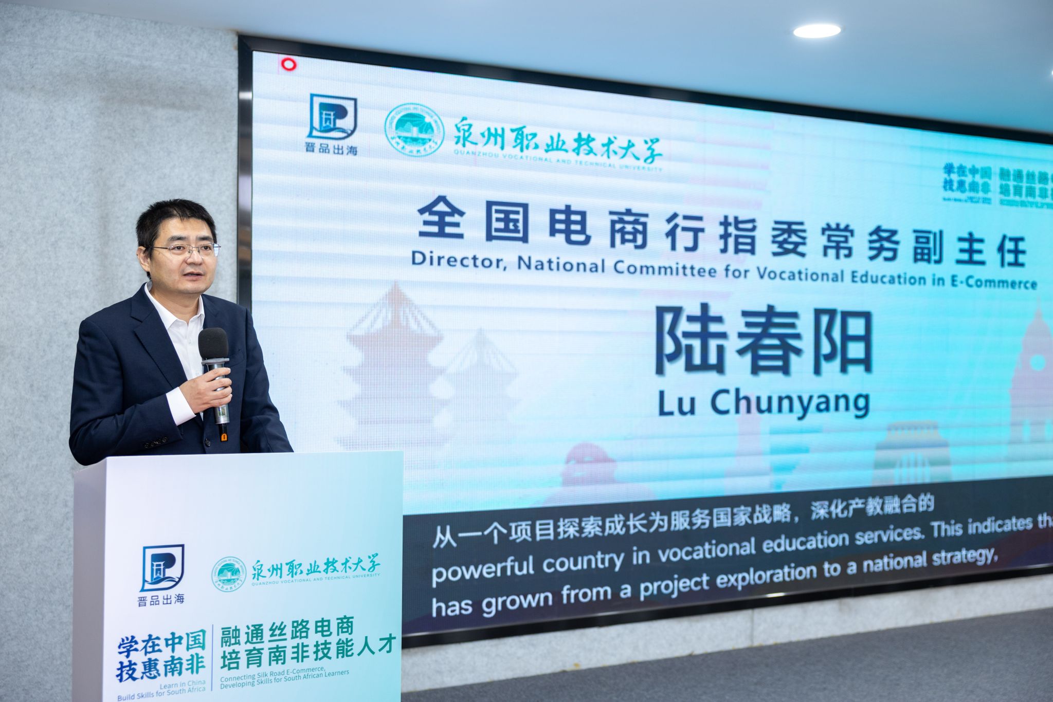 学本领、广交友、链资源泉州职业技术大学校长吴滨如在致辞中,特别感谢全国电子商务职业教育教学指导委员会、晋江市委市政府、晋江市商务局、泉州和晋江的电商行业协会、企业伙伴们对学校和“学在中国”计划的支持。