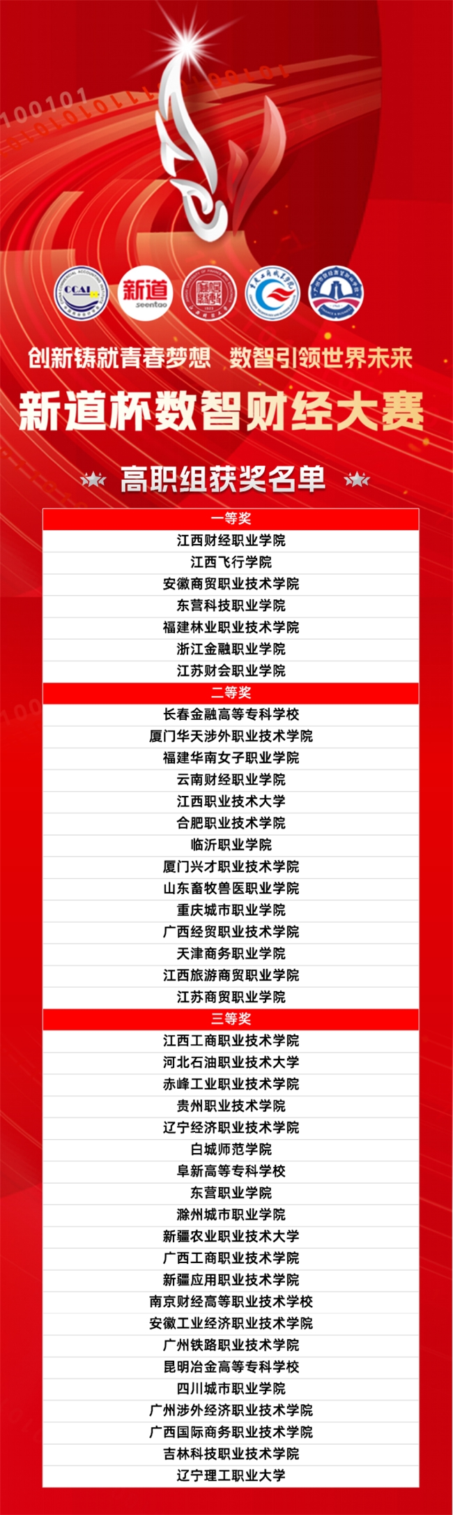 12月1日,2024“新道杯”数智财经大赛总决赛成功落幕。本届大赛由中国商业会计学会、新道科技股份有限公司主办,江西财经大学(本科组)、重庆工商职业学院(高职组)、广州市财经商贸职业学校(中职组、中职教师组)承办。来自全国各地的74支本科参赛队伍、71支高职参赛队伍经过两天激烈比拼,江西财经大学、泉州职业技术大学、蚌埠工商学院、赣南师范大学科技学院、北华大学、山东外国语职业技术大学、江西农业大学荣获大赛本科组一等奖,江西财经职业学院、江西飞行学院、安徽商贸职业技术学院、东营科技职业学院、福建林业职业技术学院、浙江金融职业学院、江苏财会职业学院荣获大赛高职组一等奖。