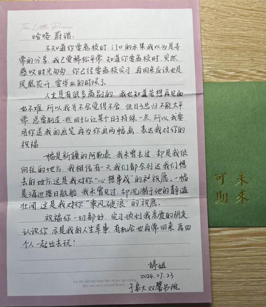 关键时刻,双馨书院老师潘婷婷帮他分析,更换专业课书本这件事,是所有考研学子都要面对的困难,并鼓励他不要放弃。这位经常送给他画画、给他写信的潘老师,总会在关键时刻鼓励他、支持他。