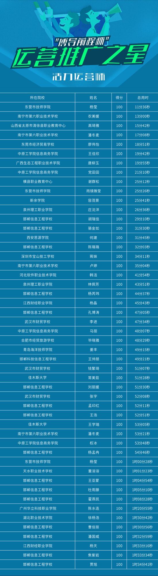 我校池轶鹏在第二场比赛中,以16秒满分的成绩获得“运营推广之星”称号,卓秋芬在第三场比赛中,以11秒满分的成绩获得“运营推广之星”称号;王绵绵、杨蕊、范碧琴、赵辉获“最强运营师”称号;庄沈洋、林佩芳获“活力运营师”称号。指导老师:郭学超。