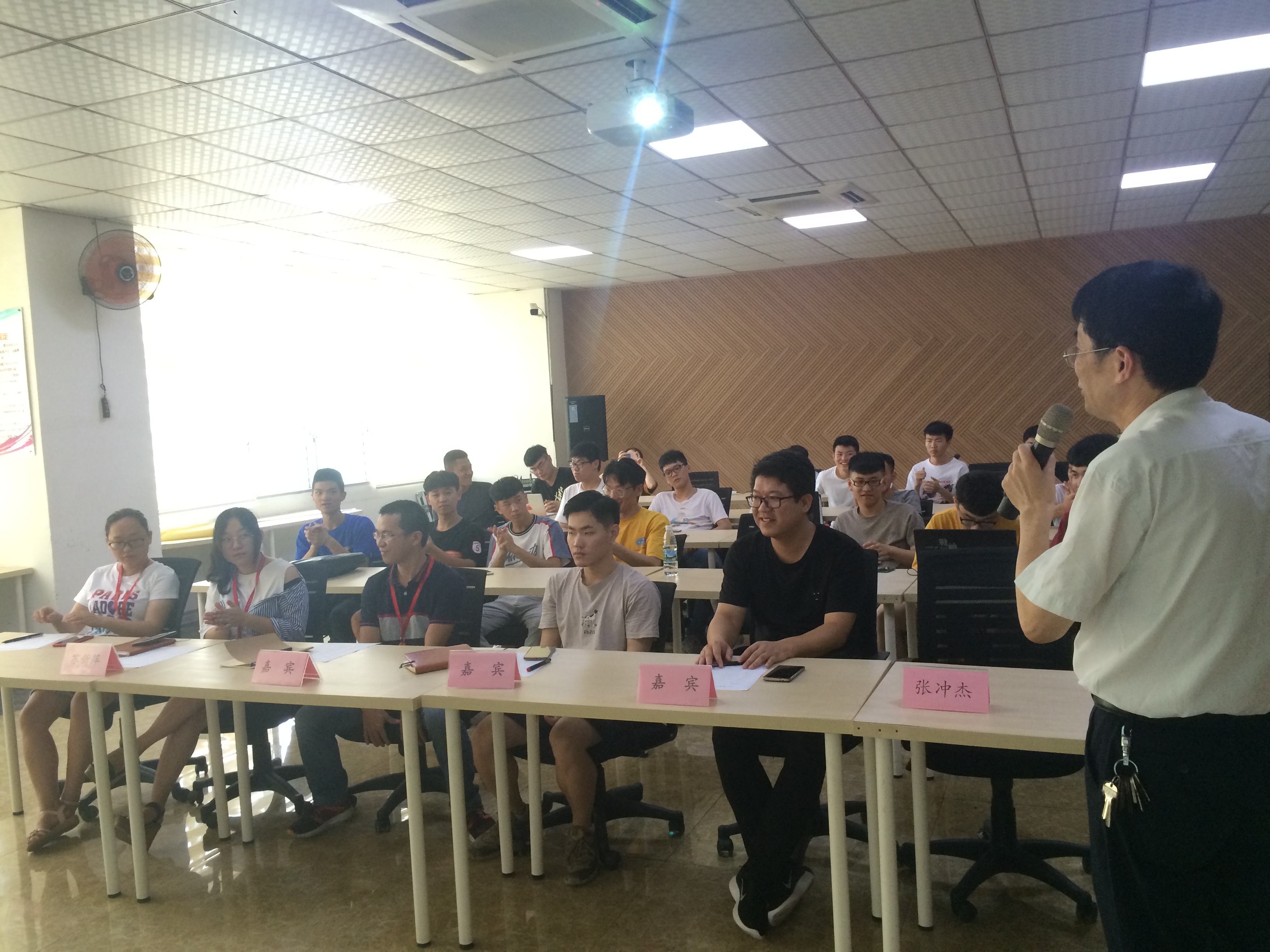 629午,我系电子信息工程技术专业校主楼第二会议室举行17级电子信息实训成果汇报会。会议邀请了科研处郭霏霏老师、教务处许亿老师、工学院张水参老师,及电子信息专业王燕平老师,苏新萍辅导员等担任评委,会议由电子专业主任王志明老师主持,17级电子信息工程技术专业全体学生参加了本次活动。