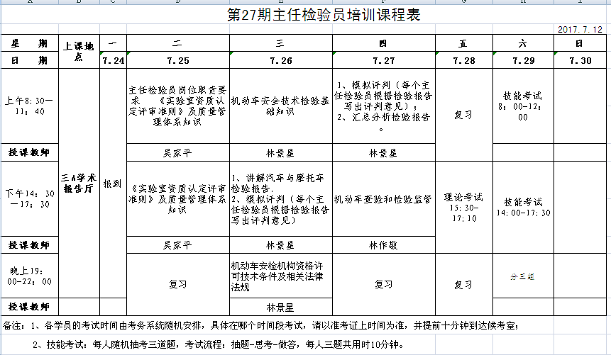福建省质量技术监督局定于2017年7月28日至7月29日举行第27期机动车安检机构主任检验员考试。故为做好相关考务工作,以便为福建省各机动车安检机构加深对考试知识的理解,本鉴定站决定举办第27期机动车安检机构主任检验人员培训,具体时间安排如下: