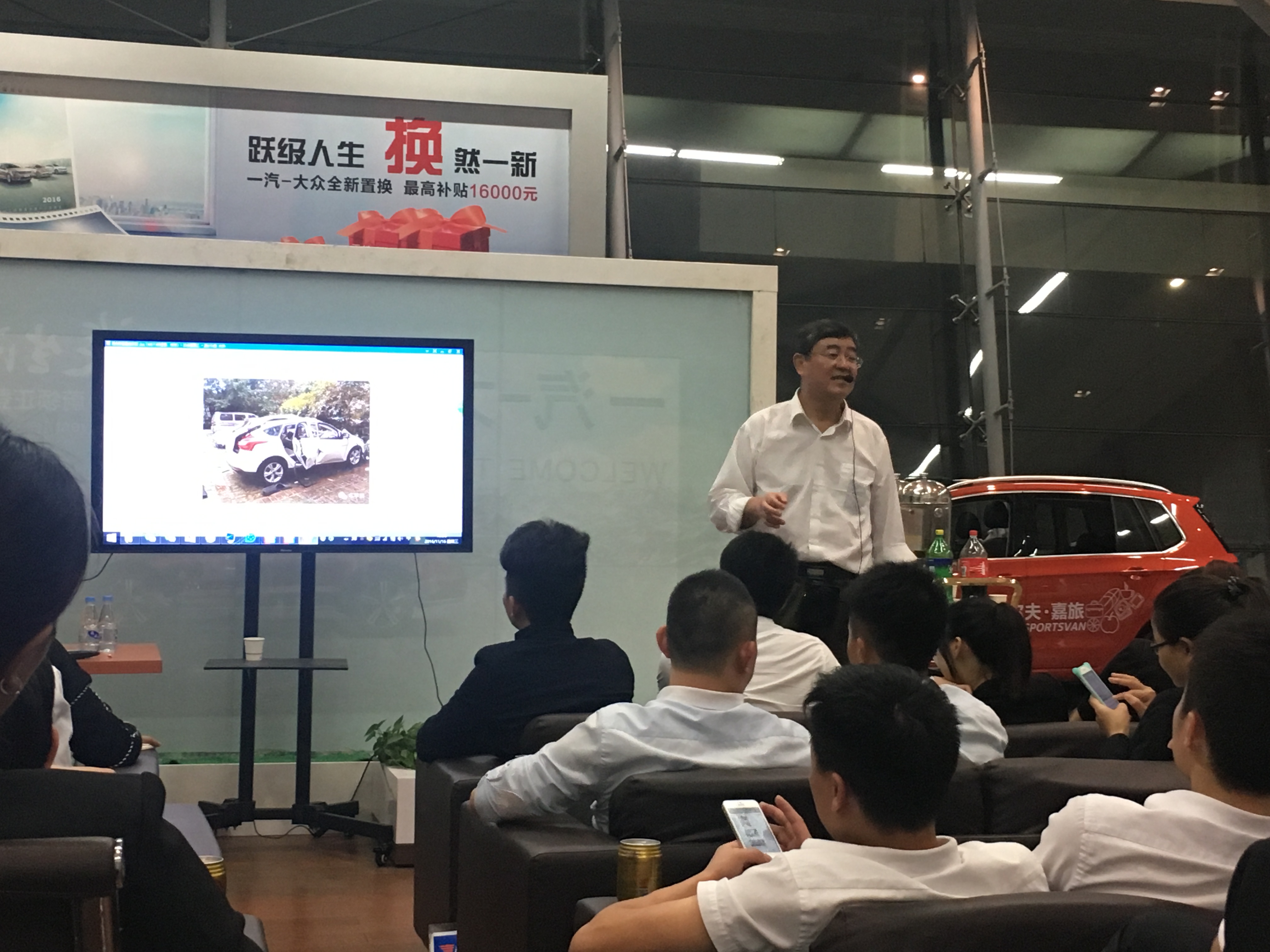 2016 年11月16晚6时,令人兴奋的是此次培训的老师竟是一汽大众资深培训师、在汽车营销界和汽车媒体圈享有盛名的正高级工程师——洪治平老师,洪老师虽已退休,却非常喜欢接纳网络时代出现的一些新鲜事物,特别注重在汽车营销中使用高科技的数码产品作为营销辅助工具,在整个讲课过程中,他利用新媒体的教学手段,将所有的材料整理成二维码让大家直接扫描讲解,强调这些是可以很直观分享给客户、击败竞争对手的资料,他还将自己2011年以来在《汽车知识》杂志上发表的科普文章集结成一个APP应用程序,放在手机中方便翻阅。在腾讯微博上长期主持《洪工侃车》和《百万公里英雄车》等专题,目前他的微博粉丝已近150万人。
