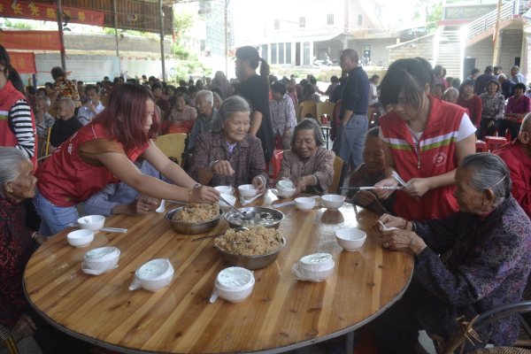 志愿者们为老人们盛饭