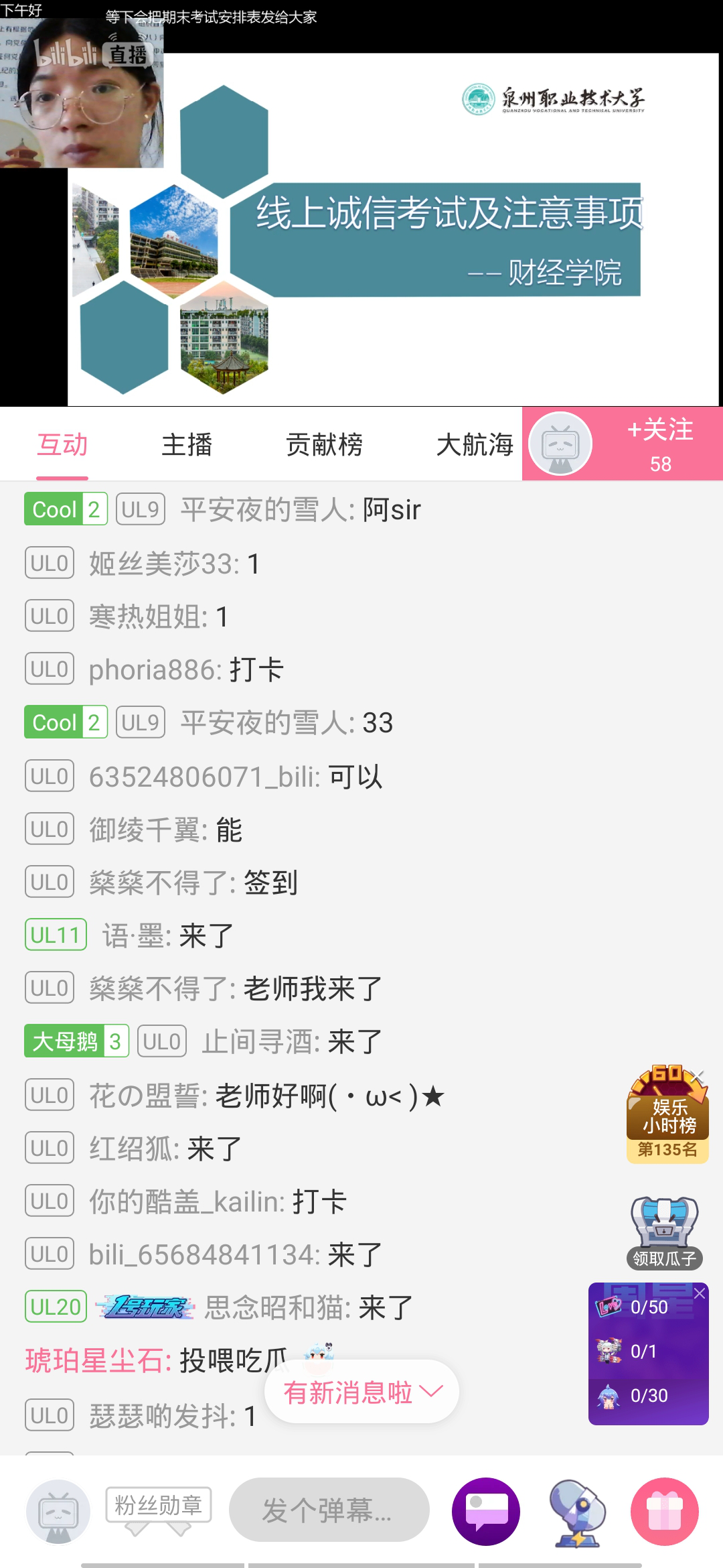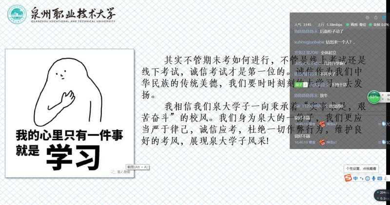 此次会议对象是19级财经学子,期末考试又双叒叕来临,由于疫情影响,学生们不得已采用线上的方式进行考试,希望家长在家全程监考,徐燕琴辅导员关心鼓舞了同学们,告诫他们要诚信考试,懂得诚实守信是中华民族的传统美德,现代社会更需要诚实守信。反对虚假和不守信用的行为,反省自己不诚实不守信的行为,做一个诚信的大学生。增强自信,努力做到说话做事实实在在,表里如一。诚信考试,做文明考生。重要的是一个“诚”字。希望泉大的学子秉承“实事求是,艰苦奋斗”的校风,不负众望,砥砺前行,靠自己的双手撷取果实。